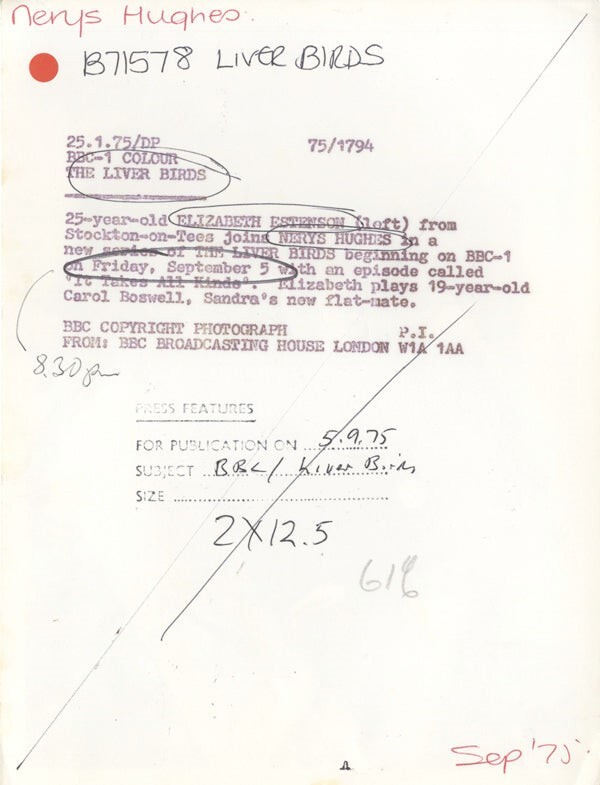 The Liver Birds Elizabeth Estenson, Nerys Hughes Original 6x8 approx Photo Stamped with Snipe 1975 VG Condition This item is an ORIGINAL 8x10 photo from the historic archives of Silver Screen Mementos. This original photograph was made in the actual year the film, television show or event was produced. The movie studios produced publicity photographs for distribution to the press, photo agencies and publicity departments to advertise the film/tv show or event. Very often original photos have press release information on the reverse of the photo - movie credits, description of the scene, event and people involved. This is a historic piece of cinema art and is being offered from one collector to another, no rights given or implied. Silver Screen are gradually releasing thousands of Original Photographs, Transparencies, Negatives, Lobby Cards, Posters, Magazines and other memorabilia from our historic archive.