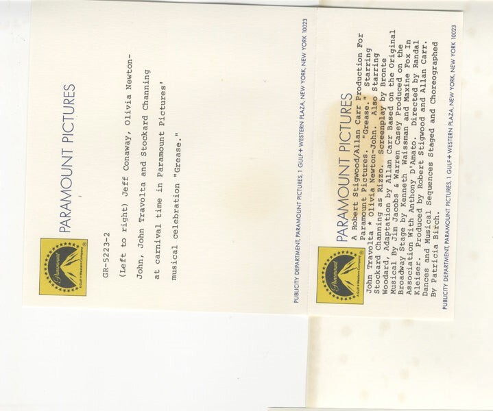 Grease Olivia Newton John, John Travolta, Stockard Channing, Jeff Conaway, Carnival Scene Original 8x10 Photo with Snipe 1977 Near Mint Condition This item is an ORIGINAL 8x10 photo from the historic archives of Silver Screen Mementos. This original photograph was made in the actual year the film, television show or event was produced. The movie studios produced publicity photographs for distribution to the press, photo agencies and publicity departments to advertise the film/tv show or event. Very often original photos have press release information on the reverse of the photo - movie credits, description of the scene, event and people involved. This is a historic piece of cinema art and is being offered from one collector to another, no rights given or implied. Silver Screen are gradually releasing thousands of Original Photographs, Transparencies, Negatives, Lobby Cards, Posters, Magazines and other memorabilia from our historic archive.