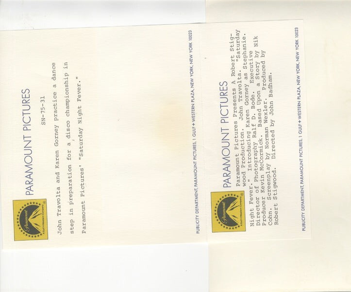 Saturday Night Live John Travolta, leggy Karen Gorney dancing Original 8x10 Photo with Snipe 1977 Near Mint Condition This item is an ORIGINAL 8x10 photo from the historic archives of Silver Screen Mementos. This original photograph was made in the actual year the film, television show or event was produced. The movie studios produced publicity photographs for distribution to the press, photo agencies and publicity departments to advertise the film/tv show or event. Very often original photos have press release information on the reverse of the photo - movie credits, description of the scene, event and people involved. This is a historic piece of cinema art and is being offered from one collector to another, no rights given or implied. Silver Screen are gradually releasing thousands of Original Photographs, Transparencies, Negatives, Lobby Cards, Posters, Magazines and other memorabilia from our historic archive.