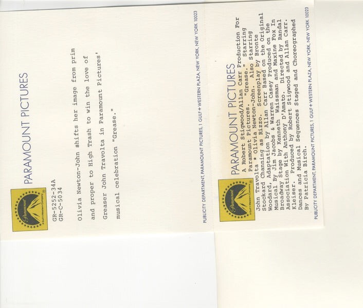 Grease Olivia Newton John Prim & Proper & Sexy Sandy Original 8x10 Photo with Snipe 1977 Near Mint Condition This item is an ORIGINAL 8x10 photo from the historic archives of Silver Screen Mementos. This original photograph was made in the actual year the film, television show or event was produced. The movie studios produced publicity photographs for distribution to the press, photo agencies and publicity departments to advertise the film/tv show or event. Very often original photos have press release information on the reverse of the photo - movie credits, description of the scene, event and people involved. This is a historic piece of cinema art and is being offered from one collector to another, no rights given or implied. Silver Screen are gradually releasing thousands of Original Photographs, Transparencies, Negatives, Lobby Cards, Posters, Magazines and other memorabilia from our historic archive.