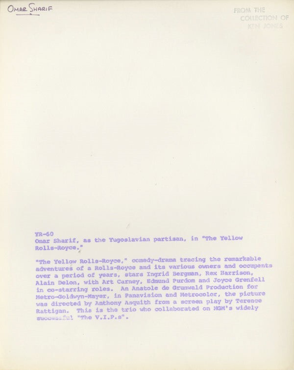 Omar Sharif The Yellow Rolls Royce 1964 Portrait Original 8x10 Photo with Snipe VG/Near Mint Condition This item is an ORIGINAL 8x10 photo from the historic archives of Silver Screen Mementos. This original photograph was made in the actual year the film, television show or event was produced. The movie studios produced publicity photographs for distribution to the press, photo agencies and publicity departments to advertise the film/tv show or event. Very often original photos have press release information on the reverse of the photo - movie credits, description of the scene, event and people involved. This is a historic piece of cinema art and is being offered from one collector to another, no rights given or implied. Silver Screen are gradually releasing thousands of Original Photographs, Transparencies, Negatives, Lobby Cards, Posters, Magazines and other memorabilia from our historic archive.