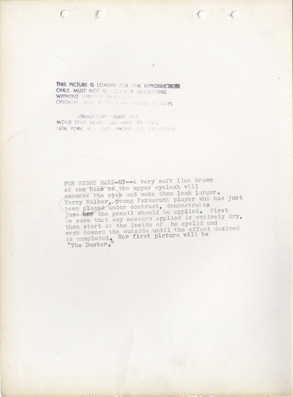 Terry Walker 1936 The Duster Publicity Glamour applying make up Original 8x11 Keybook Photo Stamped with Snipe VG Condition This item is an ORIGINAL 8x10 photo from the historic archives of Silver Screen Mementos. This original photograph was made in the actual year the film, television show or event was produced. The movie studios produced publicity photographs for distribution to the press, photo agencies and publicity departments to advertise the film/tv show or event. Very often original photos have press release information on the reverse of the photo - movie credits, description of the scene, event and people involved. This is a historic piece of cinema art and is being offered from one collector to another, no rights given or implied. Silver Screen are gradually releasing thousands of Original Photographs, Transparencies, Negatives, Lobby Cards, Posters, Magazines and other memorabilia from our historic archive.