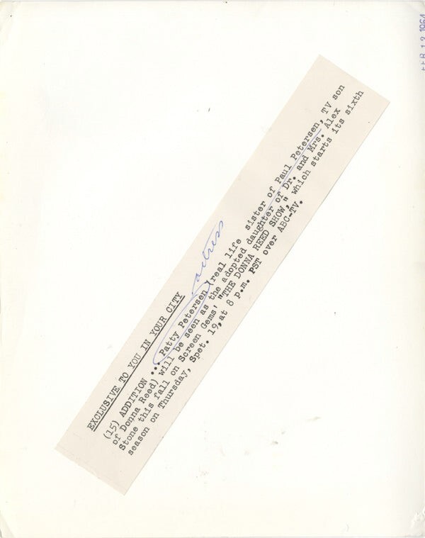 Patty Petersen The Donna Reed Show Portrait Original 8x10 approx Photo with Snipe 1964 VG Condition This item is an ORIGINAL 8x10 photo from the historic archives of Silver Screen Mementos. This original photograph was made in the actual year the film, television show or event was produced. The movie studios produced publicity photographs for distribution to the press, photo agencies and publicity departments to advertise the film/tv show or event. Very often original photos have press release information on the reverse of the photo - movie credits, description of the scene, event and people involved. This is a historic piece of cinema art and is being offered from one collector to another, no rights given or implied. Silver Screen are gradually releasing thousands of Original Photographs, Transparencies, Negatives, Lobby Cards, Posters, Magazines and other memorabilia from our historic archive.