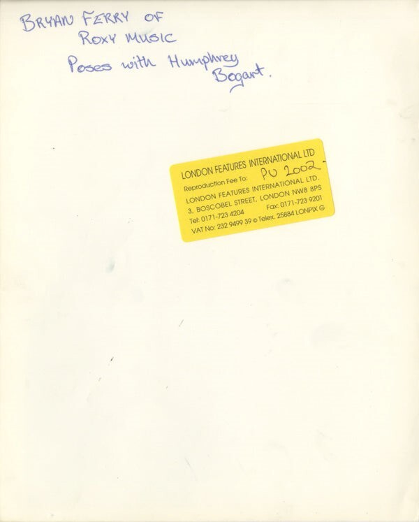 Bryan Ferry Cool Pose holding beer by Humphrey Bogart Poster Original 8x10 Photo - classic Roxy Music Bryan Ferry pose - Near Mint This is an Original vintage photograph from the year of the concert, photo shoot or event measuring approximately 8x10 inches (20x25 cm) unless otherwise stated. Many Original vintage photographs carry the agency or photographer stamp on the back. This is a rare collectors item being offered from one collector to another, no nights given or implied. Silver Screen are gradually releasing thousands of Original Photographs, Transparencies, Negatives, Lobby Cards, Posters, Magazines and other memorabilia from our historic archive.