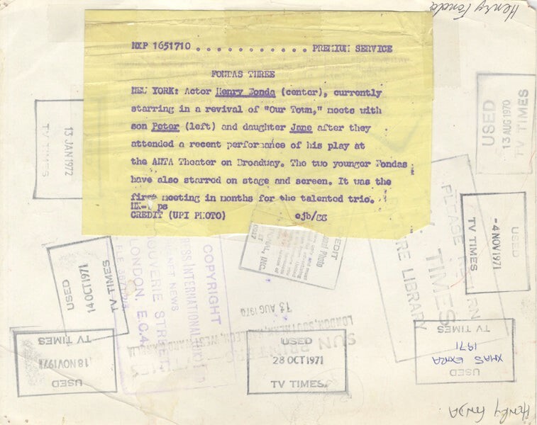 Henry Fonda daughter Jane Son Peter 1970 Stamped Original 8x10 Photo with snipe VG Condition This item is an ORIGINAL 8x10 photo from the historic archives of Silver Screen Mementos. This original photograph was made in the actual year the film, television show or event was produced. The movie studios produced publicity photographs for distribution to the press, photo agencies and publicity departments to advertise the film/tv show or event. Very often original photos have press release information on the reverse of the photo - movie credits, description of the scene, event and people involved. This is a historic piece of cinema art and is being offered from one collector to another, no rights given or implied. Silver Screen are gradually releasing thousands of Original Photographs, Transparencies, Negatives, Lobby Cards, Posters, Magazines and other memorabilia from our historic archive.