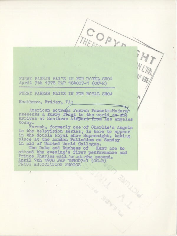 Farrah Fawcett smiling Heathrow Airport 1978 Stamped Original Photo with snipe VG/Near Mint This item is an ORIGINAL 8x10 photo from the historic archives of Silver Screen Mementos. This original photograph was made in the actual year the film, television show or event was produced. The movie studios produced publicity photographs for distribution to the press, photo agencies and publicity departments to advertise the film/tv show or event. Very often original photos have press release information on the reverse of the photo - movie credits, description of the scene, event and people involved. This is a historic piece of cinema art and is being offered from one collector to another, no rights given or implied. Silver Screen are gradually releasing thousands of Original Photographs, Transparencies, Negatives, Lobby Cards, Posters, Magazines and other memorabilia from our historic archive.