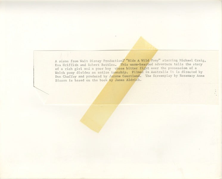Ride A Wild Pony 1975 Robert Bettles riding Welsh Horse Original 8x10 Photo with Snipe Near Mint Condition This item is an ORIGINAL 8x10 photo from the historic archives of Silver Screen Mementos. This original photograph was made in the actual year the film, television show or event was produced. The movie studios produced publicity photographs for distribution to the press, photo agencies and publicity departments to advertise the film/tv show or event. Very often original photos have press release information on the reverse of the photo - movie credits, description of the scene, event and people involved. This is a historic piece of cinema art and is being offered from one collector to another, no rights given or implied. Silver Screen are gradually releasing thousands of Original Photographs, Transparencies, Negatives, Lobby Cards, Posters, Magazines and other memorabilia from our historic archive.