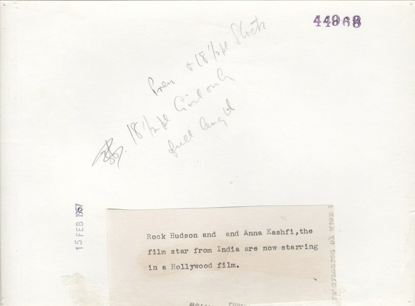 Battle Hymn Rock Hudson, Anna Kashfi Korean War Original 7x9 approx Photo Stamped with Snipe 1957 VG Condition This item is an ORIGINAL 8x10 photo from the historic archives of Silver Screen Mementos. This original photograph was made in the actual year the film, television show or event was produced. The movie studios produced publicity photographs for distribution to the press, photo agencies and publicity departments to advertise the film/tv show or event. Very often original photos have press release information on the reverse of the photo - movie credits, description of the scene, event and people involved. This is a historic piece of cinema art and is being offered from one collector to another, no rights given or implied. Silver Screen are gradually releasing thousands of Original Photographs, Transparencies, Negatives, Lobby Cards, Posters, Magazines and other memorabilia from our historic archive.