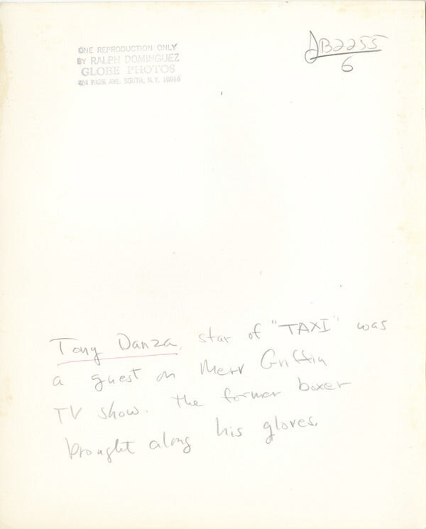 Tony Danza Taxi era 1979 holding boxing gloves Merv Griffin TV Show appearance Original 8x10 Photo Stamped VG Condition This item is an ORIGINAL 8x10 photo from the historic archives of Silver Screen Mementos. This original photograph was made in the actual year the film, television show or event was produced. The movie studios produced publicity photographs for distribution to the press, photo agencies and publicity departments to advertise the film/tv show or event. Very often original photos have press release information on the reverse of the photo - movie credits, description of the scene, event and people involved. This is a historic piece of cinema art and is being offered from one collector to another, no rights given or implied. Silver Screen are gradually releasing thousands of Original Photographs, Transparencies, Negatives, Lobby Cards, Posters, Magazines and other memorabilia from our historic archive.