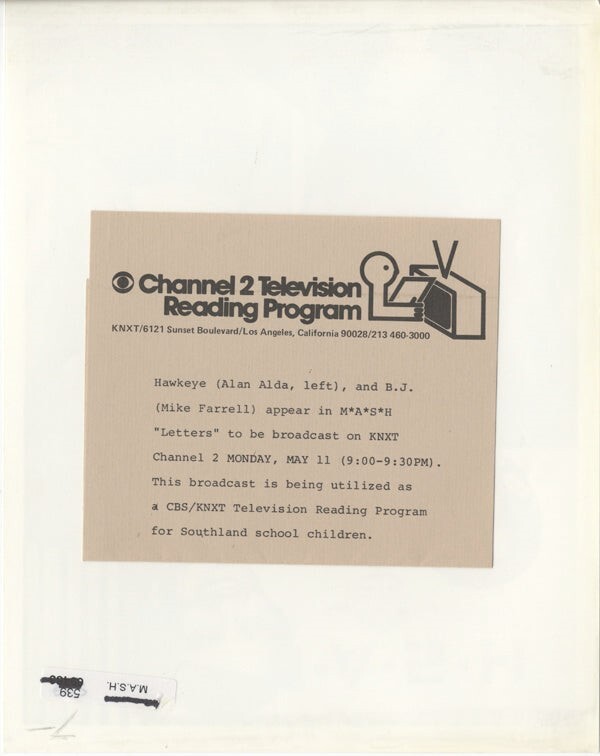 M*A*S*H Alan Alda, Mike Farrell on set between scenes Original 8x10 Photo with CBS Snipe Near Mint Condition This item is an ORIGINAL 8x10 photo from the historic archives of Silver Screen Mementos. This original photograph was made in the actual year the film, television show or event was produced. The movie studios produced publicity photographs for distribution to the press, photo agencies and publicity departments to advertise the film/tv show or event. Very often original photos have press release information on the reverse of the photo - movie credits, description of the scene, event and people involved. This is a historic piece of cinema art and is being offered from one collector to another, no rights given or implied. Silver Screen are gradually releasing thousands of Original Photographs, Transparencies, Negatives, Lobby Cards, Posters, Magazines and other memorabilia from our historic archive.