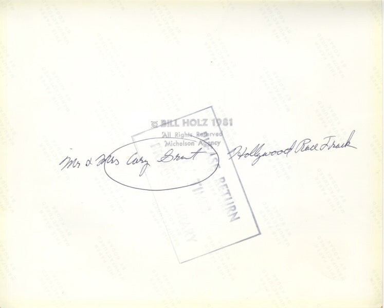 Cary Grant with wife Barbara, Gregory Peck Candid Hollywood Race Track Original 8x10 Photo Stamped 1981 Near Mint Condition This item is an ORIGINAL 8x10 photo from the historic archives of Silver Screen Mementos. This original photograph was made in the actual year the film, television show or event was produced. The movie studios produced publicity photographs for distribution to the press, photo agencies and publicity departments to advertise the film/tv show or event. Very often original photos have press release information on the reverse of the photo - movie credits, description of the scene, event and people involved. This is a historic piece of cinema art and is being offered from one collector to another, no rights given or implied. Silver Screen are gradually releasing thousands of Original Photographs, Transparencies, Negatives, Lobby Cards, Posters, Magazines and other memorabilia from our historic archive.