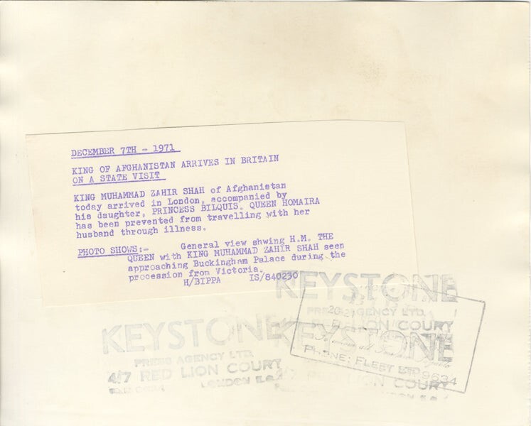 Queen Elizabeth with King Muhammad Zahir Shah of Afghanistan riding in carriage in London Original 8x10 Double Weight Silver Gelatin Photo Stamped with Snipe 1971 VG/Near Mint Condition This is an original photograph from our historic archives. We have a huge archive of original photographs, negatives, transparencies, posters, magazines and rare memorabilia that we are gradually releasing.