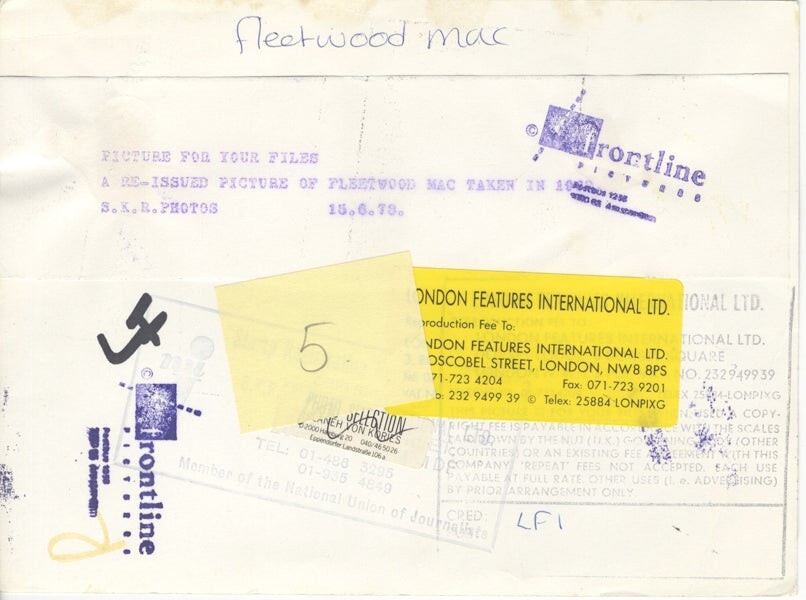 Fleetwood Mac Christine McVie, John McVie, Mick Fleetwood, Danny Kirwin, Jeremy Spencer Early Band Portrait Original 6x8 Photo Stamped with Snipe 1973, an historic early original portrait of the legendary group - VG Condition (wear to edges, creasing) This is an Original vintage photograph from the year of the concert, photo shoot or event measuring approximately 8x10 inches (20x25 cm) unless otherwise stated. Many Original vintage photographs carry the agency or photographer stamp on the back. This is a rare collectors item being offered from one collector to another, no nights given or implied. Silver Screen are gradually releasing thousands of Original Photographs, Transparencies, Negatives, Lobby Cards, Posters, Magazines and other memorabilia from our historic archive.