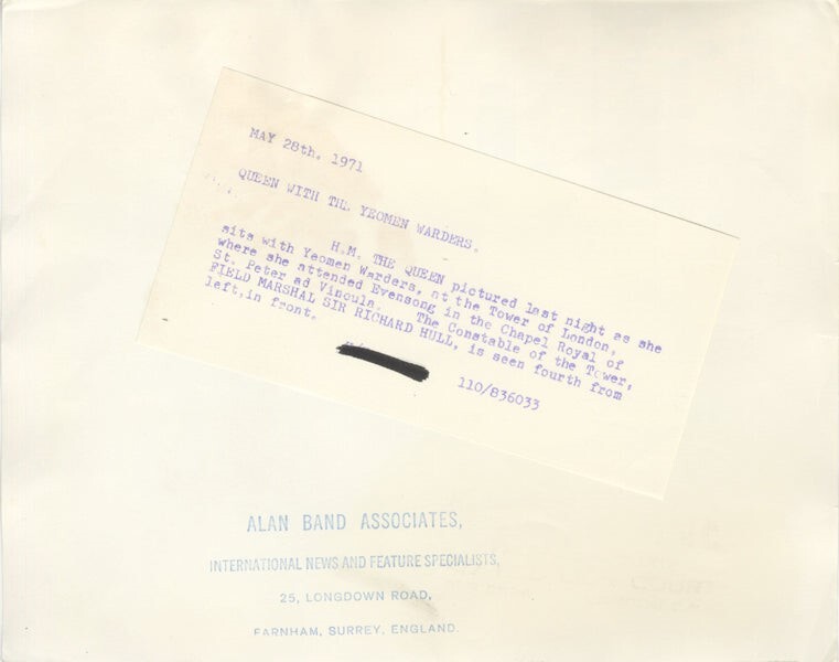 Queen Elizabeth Portrait with Yeomen Warders aka Beefeaters Tower of London Original 8x10 Photo Stamped with Snipe 1971 VG Condition This is an original photograph from our historic archives. We have a huge archive of original photographs, negatives, transparencies, posters, magazines and rare memorabilia that we are gradually releasing.