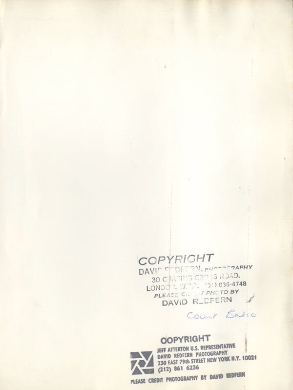 Count Basie Big Band Icon Profile Portrait smoking cigar Original 9x12 inch approx Double Weight Silver Gelatin Photo Stamped - A wonderful and very rare original photograph of the legendary American Jazz pianist and bandleader in VG Condition This is an Original vintage photograph from the year of the concert, photo shoot or event measuring approximately 8x10 inches (20x25 cm) unless otherwise stated. Many Original vintage photographs carry the agency or photographer stamp on the back. This is a rare collectors item being offered from one collector to another, no nights given or implied. Silver Screen are gradually releasing thousands of Original Photographs, Transparencies, Negatives, Lobby Cards, Posters, Magazines and other memorabilia from our historic archive.