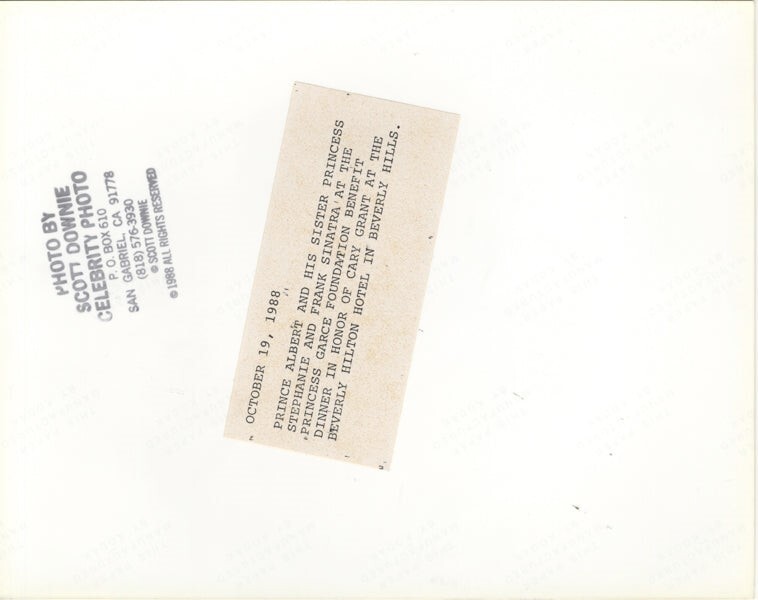 Princess Stephanie, Prince Rainier, Prince Albert of Monaco Beverly Hilton Princess Grace Foundation Event for Cary Grant Original 7x9 Photo Stamped with Snipe 1988 Near Mint Condition This is an Original vintage photograph from the year of the concert, photo shoot or event measuring approximately 8x10 inches (20x25 cm) unless otherwise stated. Many Original vintage photographs carry the agency or photographer stamp on the back. This is a rare collectors item being offered from one collector to another, no nights given or implied. Silver Screen are gradually releasing thousands of Original Photographs, Transparencies, Negatives, Lobby Cards, Posters, Magazines and other memorabilia from our historic archive.