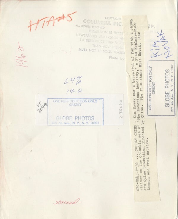 Kim Novak cudding Chimp on set Notorious Landlady 1962 Original Stamped 8x10 Photo with paper caption snipe VG Condition This item is an ORIGINAL 8x10 photo from the historic archives of Silver Screen Mementos. This original photograph was made in the actual year the film, television show or event was produced. The movie studios produced publicity photographs for distribution to the press, photo agencies and publicity departments to advertise the film/tv show or event. Very often original photos have press release information on the reverse of the photo - movie credits, description of the scene, event and people involved. This is a historic piece of cinema art and is being offered from one collector to another, no rights given or implied. Silver Screen are gradually releasing thousands of Original Photographs, Transparencies, Negatives, Lobby Cards, Posters, Magazines and other memorabilia from our historic archive.