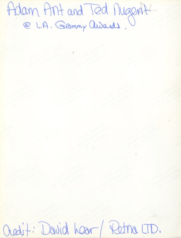 Rockstar Ted Nugent, Adam Ant Candid 1982 Grammy Awards Original 6x8 approx Photo Stamped Near Mint Condition This is an Original vintage photograph from the year of the concert, photo shoot or event measuring approximately 8x10 inches (20x25 cm) unless otherwise stated. Many Original vintage photographs carry the agency or photographer stamp on the back. This is a rare collectors item being offered from one collector to another, no nights given or implied. Silver Screen are gradually releasing thousands of Original Photographs, Transparencies, Negatives, Lobby Cards, Posters, Magazines and other memorabilia from our historic archive.