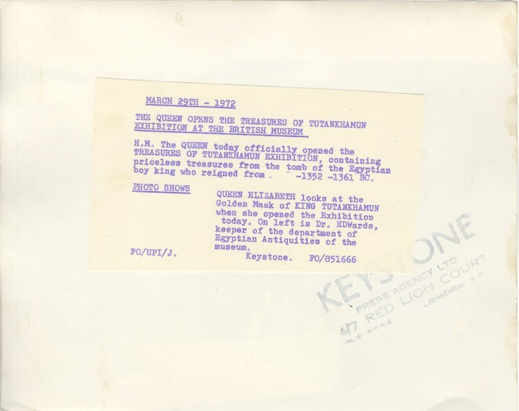 HM Queen Elizabeth at King Tutankhamun Exhibit at British Museum Original 8x10 Photo Stamped with Snipe 1972 VG/Near Mint Condition This is an original photograph from our historic archives. We have a huge archive of original photographs, negatives, transparencies, posters, magazines and rare memorabilia that we are gradually releasing.