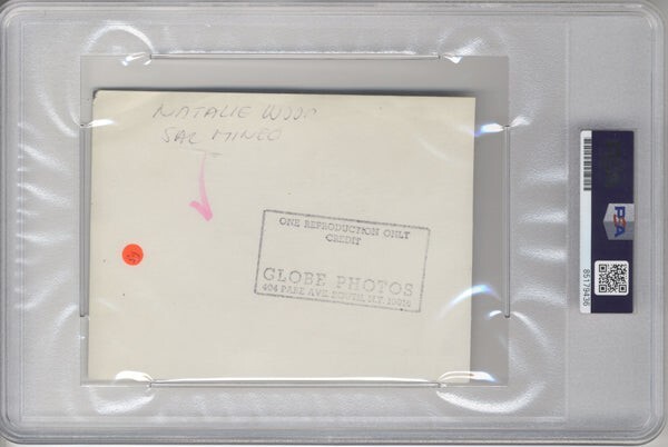 Natalie Wood kiss Sal Mineo Rebel Without A Cause 1955 Vintage 6x4 Photo PSA Type 3 - A very rare 6x4 inch stamped photograph of Natalie Wood about to kiss co-star Sal Mineo as they pose in vintage car during the making of the 1955 classic 'Rebel Without A Cause'. This unique photograph has been professionally graded by PSA Type 3 and slabbed. The overall size is approx 10x7 inches. This is a rare vintage photograph that has been professionally graded by PSA and encased in plastic display holder (slabbed) to ensure its value and integrity. PSA developed a grading system for photographs as follows. Type I – A 1st generation photograph, developed from the original negative, during the period (within approximately two years of when the picture was taken). Type II – A photograph, developed from the original negative, during the period (more than approximately two years after the picture was taken). Type III – A 2nd generation photograph, developed from a duplicate negative or wire transmission, during the period (within approximately two years of when the picture was taken). Type IV – A 2nd generation photograph (or 3rd or later generation), developed from a duplicate negative or wire transmission, during a later period (more than approximately two years after the picture was taken). Type 1 photographs are the most desirable and valuable of the four photograph types because of their vintage and originality. This collector's item is being sold from one collector to another, no rights are given or implied. Silver Screen Mementos are gradually releasing from their vast archives thousands of original photographs, transparencies, negatives, slides, lobby cards and other movie or television memorabilia.