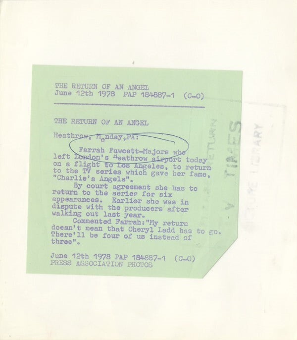 Farrah Fawcett Charlie's Angels Gorgeous smile Original 7x8 Photo Stamped with Snipe 1978 VG/Near Mint Condition This item is an ORIGINAL 8x10 photo from the historic archives of Silver Screen Mementos. This original photograph was made in the actual year the film, television show or event was produced. The movie studios produced publicity photographs for distribution to the press, photo agencies and publicity departments to advertise the film/tv show or event. Very often original photos have press release information on the reverse of the photo - movie credits, description of the scene, event and people involved. This is a historic piece of cinema art and is being offered from one collector to another, no rights given or implied. Silver Screen are gradually releasing thousands of Original Photographs, Transparencies, Negatives, Lobby Cards, Posters, Magazines and other memorabilia from our historic archive.
