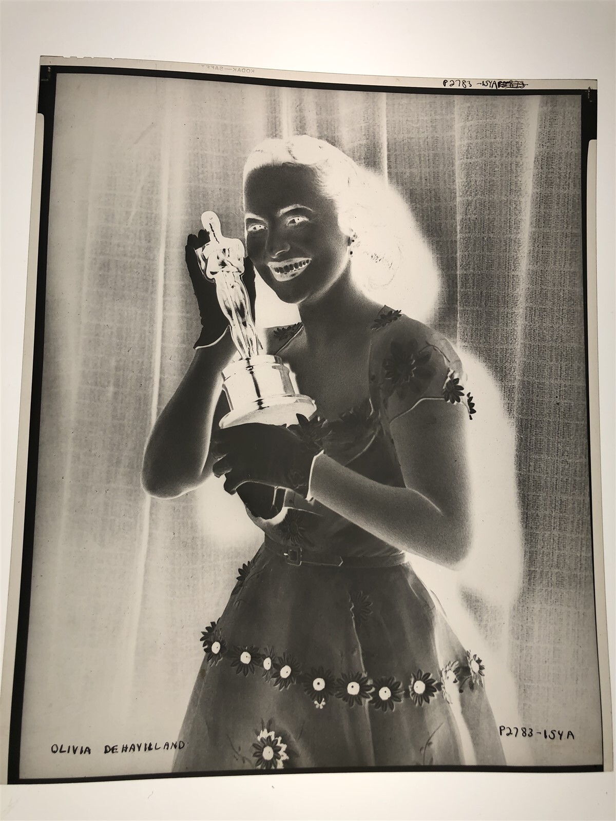 Olivia de Havilland holding 1950 Best Actress Academy Award Oscar for The Heiress Vintage Studio 8x10 Negative with hand applied India Ink Code This is an original studio or Record Company 8x10 inches black and white photographic negative from our historic archive. This was produced by the studio or record company to print 8x10 promotional photographs and may have the red Amberlith masking tape and credit captions attached. This is a real collector's item and would make superb quality photographs or prints. This would also be a great addition to any collection or image archive. This Vintage studio black and white photographic negative is in Excellent condition. This collector's item is being sold from one collector to another, no rights are given or implied. Silver Screen Mementos are gradually releasing from their vast archives thousands of original photographs, transparencies, negatives, slides, lobby cards and other movie or television memorabilia.
