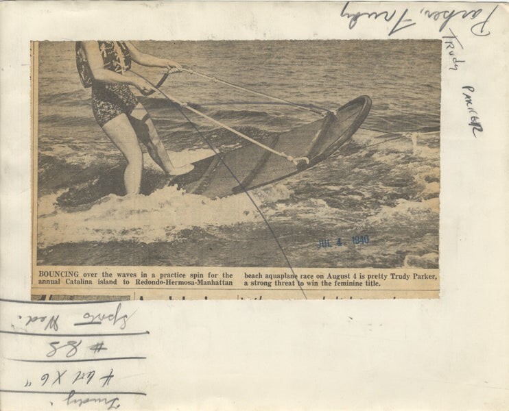 1940's Aquaplane race Trudy Parker Catalina Island to Redondo Hermosa Manhattan Beach Original 8x10 Photo with newspaper caption Snipe VG Condition This item is an ORIGINAL 8x10 photo from the historic archives of Silver Screen Mementos. This original photograph was made in the actual year the film, television show or event was produced. The movie studios produced publicity photographs for distribution to the press, photo agencies and publicity departments to advertise the film/tv show or event. Very often original photos have press release information on the reverse of the photo - movie credits, description of the scene, event and people involved. This is a historic piece of cinema art and is being offered from one collector to another, no rights given or implied. Silver Screen are gradually releasing thousands of Original Photographs, Transparencies, Negatives, Lobby Cards, Posters, Magazines and other memorabilia from our historic archive.