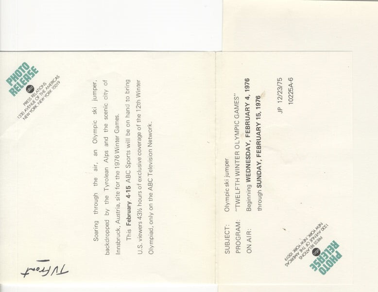 1975 Winter Olympics Airborne Skier Innsbruck Austria Crowd Scene Original 7x9 Photo with ABC Snipe VG/Near Mint Condition This item is an ORIGINAL 8x10 photo from the historic archives of Silver Screen Mementos. This original photograph was made in the actual year the film, television show or event was produced. The movie studios produced publicity photographs for distribution to the press, photo agencies and publicity departments to advertise the film/tv show or event. Very often original photos have press release information on the reverse of the photo - movie credits, description of the scene, event and people involved. This is a historic piece of cinema art and is being offered from one collector to another, no rights given or implied. Silver Screen are gradually releasing thousands of Original Photographs, Transparencies, Negatives, Lobby Cards, Posters, Magazines and other memorabilia from our historic archive.