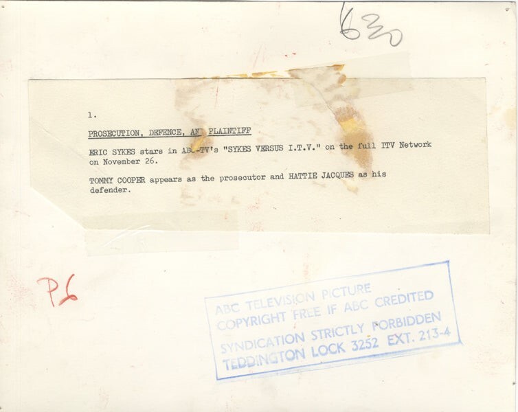 Eric Sykes Versus ITV Tommy Cooper, Hattie Jacques Original 7x9 approx Double Weight silver Gelatin Photo Stamped with Snipe VG/Near Mint Condition This item is an ORIGINAL 8x10 photo from the historic archives of Silver Screen Mementos. This original photograph was made in the actual year the film, television show or event was produced. The movie studios produced publicity photographs for distribution to the press, photo agencies and publicity departments to advertise the film/tv show or event. Very often original photos have press release information on the reverse of the photo - movie credits, description of the scene, event and people involved. This is a historic piece of cinema art and is being offered from one collector to another, no rights given or implied. Silver Screen are gradually releasing thousands of Original Photographs, Transparencies, Negatives, Lobby Cards, Posters, Magazines and other memorabilia from our historic archive.
