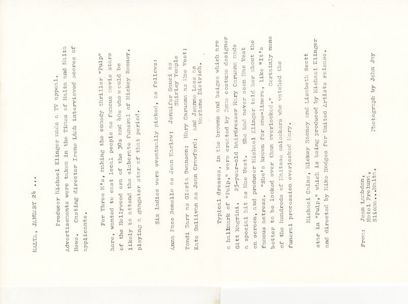 Pulp 1972 Jennifer Cauci, Anna Pace Bonello, Tondi Barr, mary Caruana, Kate Sullivan, Jeanne Lass Glamour Cast Original 8x10 Photo with Snipe Good/VG Condition (1/2" tear top margin no paper loss, wear to edges) This item is an ORIGINAL 8x10 photo from the historic archives of Silver Screen Mementos. This original photograph was made in the actual year the film, television show or event was produced. The movie studios produced publicity photographs for distribution to the press, photo agencies and publicity departments to advertise the film/tv show or event. Very often original photos have press release information on the reverse of the photo - movie credits, description of the scene, event and people involved. This is a historic piece of cinema art and is being offered from one collector to another, no rights given or implied. Silver Screen are gradually releasing thousands of Original Photographs, Transparencies, Negatives, Lobby Cards, Posters, Magazines and other memorabilia from our historic archive.