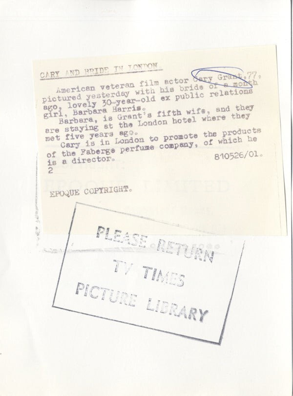Cary Grant with wife Barbara 1980's Candid London Original 6x8 Photo Stamped with Snipe VG/Near Mint Condition This item is an ORIGINAL 8x10 photo from the historic archives of Silver Screen Mementos. This original photograph was made in the actual year the film, television show or event was produced. The movie studios produced publicity photographs for distribution to the press, photo agencies and publicity departments to advertise the film/tv show or event. Very often original photos have press release information on the reverse of the photo - movie credits, description of the scene, event and people involved. This is a historic piece of cinema art and is being offered from one collector to another, no rights given or implied. Silver Screen are gradually releasing thousands of Original Photographs, Transparencies, Negatives, Lobby Cards, Posters, Magazines and other memorabilia from our historic archive.