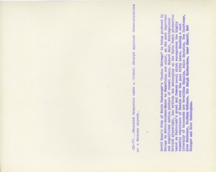 Doctor Zhivago 1965 Dragoon Attack Scene David Lean Original 8x10 approx Photo with Snipe Near Mint Condition This item is an ORIGINAL 8x10 photo from the historic archives of Silver Screen Mementos. This original photograph was made in the actual year the film, television show or event was produced. The movie studios produced publicity photographs for distribution to the press, photo agencies and publicity departments to advertise the film/tv show or event. Very often original photos have press release information on the reverse of the photo - movie credits, description of the scene, event and people involved. This is a historic piece of cinema art and is being offered from one collector to another, no rights given or implied. Silver Screen are gradually releasing thousands of Original Photographs, Transparencies, Negatives, Lobby Cards, Posters, Magazines and other memorabilia from our historic archive.