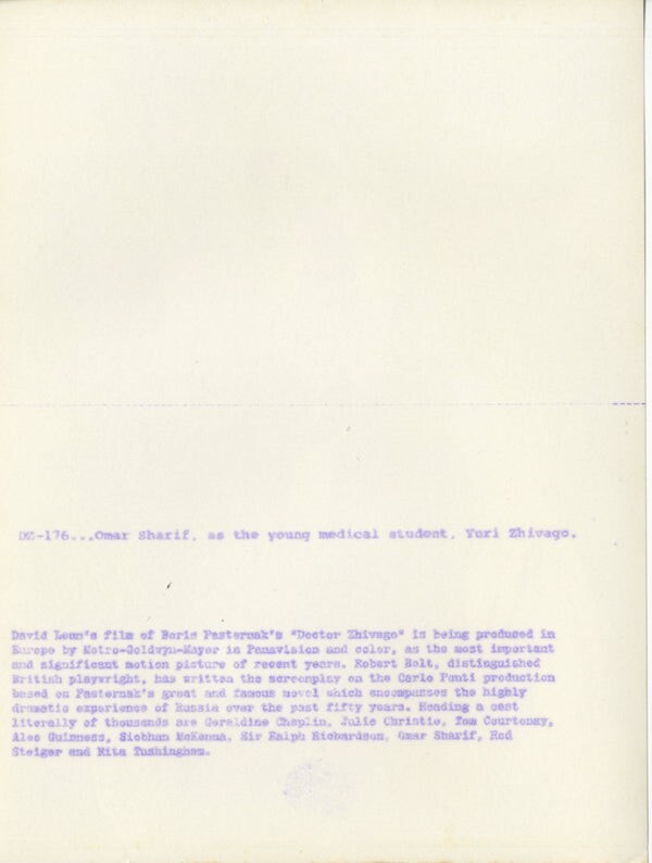 Doctor Zhivago 1965 Omar Sharif handsome Portrait David Lean Original 8x10 approx Photo with Snipe Near Mint This item is an ORIGINAL 8x10 photo from the historic archives of Silver Screen Mementos. This original photograph was made in the actual year the film, television show or event was produced. The movie studios produced publicity photographs for distribution to the press, photo agencies and publicity departments to advertise the film/tv show or event. Very often original photos have press release information on the reverse of the photo - movie credits, description of the scene, event and people involved. This is a historic piece of cinema art and is being offered from one collector to another, no rights given or implied. Silver Screen are gradually releasing thousands of Original Photographs, Transparencies, Negatives, Lobby Cards, Posters, Magazines and other memorabilia from our historic archive.