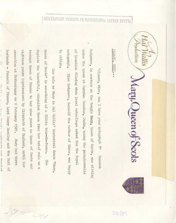 Vanessa Redgrave Mary Queen of Scots 1971 between scenes on set with fans Original 8x10 approx Double Weight Silver Gelatin Photo Stamped with Snipe VG/Near Mint Condition This item is an ORIGINAL 8x10 photo from the historic archives of Silver Screen Mementos. This original photograph was made in the actual year the film, television show or event was produced. The movie studios produced publicity photographs for distribution to the press, photo agencies and publicity departments to advertise the film/tv show or event. Very often original photos have press release information on the reverse of the photo - movie credits, description of the scene, event and people involved. This is a historic piece of cinema art and is being offered from one collector to another, no rights given or implied. Silver Screen are gradually releasing thousands of Original Photographs, Transparencies, Negatives, Lobby Cards, Posters, Magazines and other memorabilia from our historic archive.