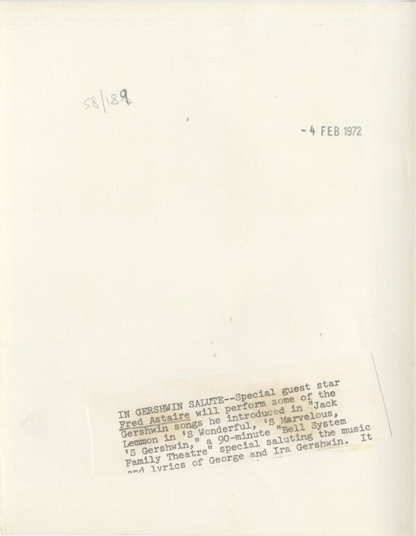 Fred Astaire 'S Marvelous 'S Gershwin dancing singing Original 7x9 Photo with Snipe 1972 Near Mint Condition This item is an ORIGINAL 8x10 photo from the historic archives of Silver Screen Mementos. This original photograph was made in the actual year the film, television show or event was produced. The movie studios produced publicity photographs for distribution to the press, photo agencies and publicity departments to advertise the film/tv show or event. Very often original photos have press release information on the reverse of the photo - movie credits, description of the scene, event and people involved. This is a historic piece of cinema art and is being offered from one collector to another, no rights given or implied. Silver Screen are gradually releasing thousands of Original Photographs, Transparencies, Negatives, Lobby Cards, Posters, Magazines and other memorabilia from our historic archive.