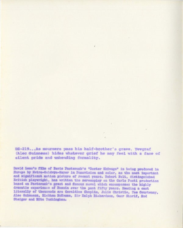 Doctor Zhivago 1965 Yevgraf, Alec Guinness, David Lean Original 8x10 approx Photo with Snipe Near Mint Condition This item is an ORIGINAL 8x10 photo from the historic archives of Silver Screen Mementos. This original photograph was made in the actual year the film, television show or event was produced. The movie studios produced publicity photographs for distribution to the press, photo agencies and publicity departments to advertise the film/tv show or event. Very often original photos have press release information on the reverse of the photo - movie credits, description of the scene, event and people involved. This is a historic piece of cinema art and is being offered from one collector to another, no rights given or implied. Silver Screen are gradually releasing thousands of Original Photographs, Transparencies, Negatives, Lobby Cards, Posters, Magazines and other memorabilia from our historic archive.