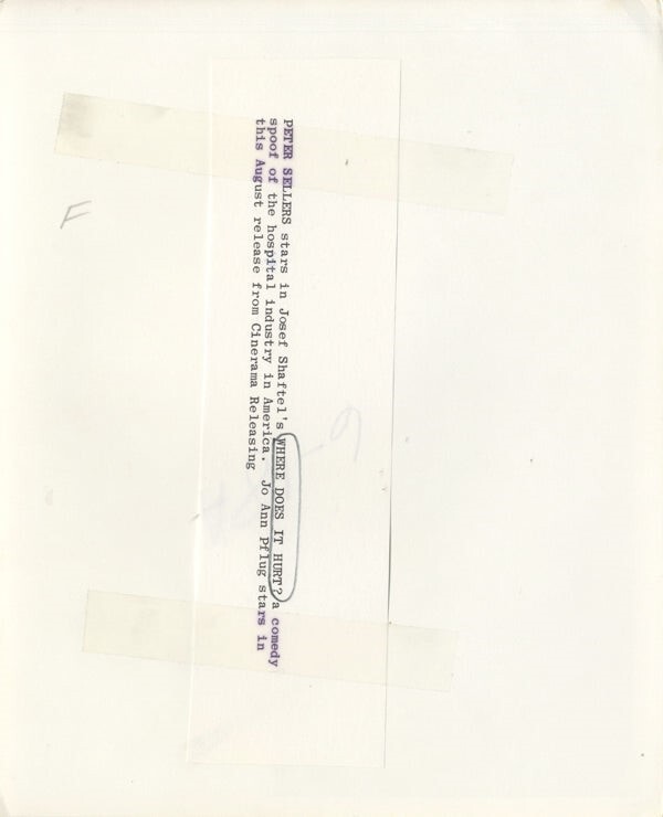 Peter Sellers Where Does It Hurt? 1972 comic scene Original 8x10 Photo with Snipe VG Condition This item is an ORIGINAL 8x10 photo from the historic archives of Silver Screen Mementos. This original photograph was made in the actual year the film, television show or event was produced. The movie studios produced publicity photographs for distribution to the press, photo agencies and publicity departments to advertise the film/tv show or event. Very often original photos have press release information on the reverse of the photo - movie credits, description of the scene, event and people involved. This is a historic piece of cinema art and is being offered from one collector to another, no rights given or implied. Silver Screen are gradually releasing thousands of Original Photographs, Transparencies, Negatives, Lobby Cards, Posters, Magazines and other memorabilia from our historic archive.