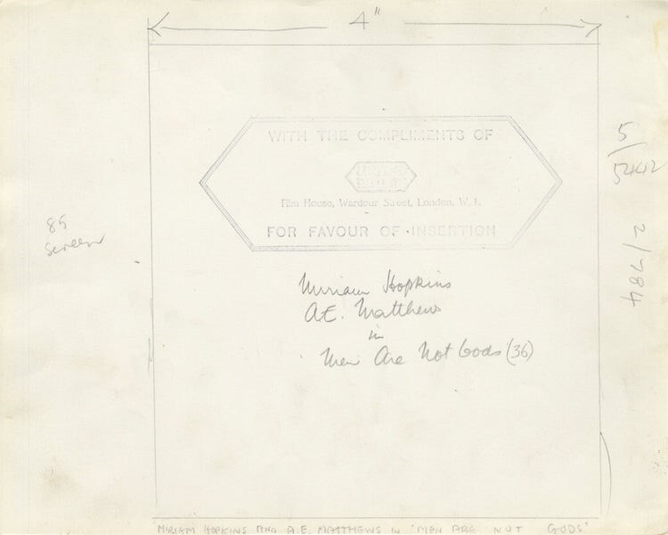 Men Are Not Gods 1936 Miriam Hopkins AE Matthews Original 8x10 Photo Stamped VG Condition This item is an ORIGINAL 8x10 photo from the historic archives of Silver Screen Mementos. This original photograph was made in the actual year the film, television show or event was produced. The movie studios produced publicity photographs for distribution to the press, photo agencies and publicity departments to advertise the film/tv show or event. Very often original photos have press release information on the reverse of the photo - movie credits, description of the scene, event and people involved. This is a historic piece of cinema art and is being offered from one collector to another, no rights given or implied. Silver Screen are gradually releasing thousands of Original Photographs, Transparencies, Negatives, Lobby Cards, Posters, Magazines and other memorabilia from our historic archive.
