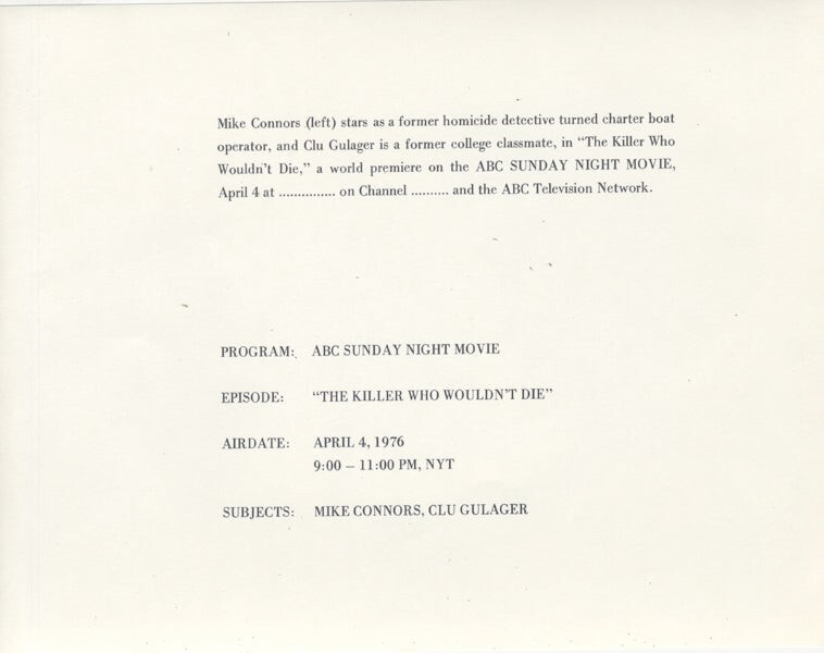 The Killer Who Wouldn't Die Mike Connors, Clu Gulager Original 7x9 Photo with ABC Snipe 1976 Near Mint Condition This item is an ORIGINAL 8x10 photo from the historic archives of Silver Screen Mementos. This original photograph was made in the actual year the film, television show or event was produced. The movie studios produced publicity photographs for distribution to the press, photo agencies and publicity departments to advertise the film/tv show or event. Very often original photos have press release information on the reverse of the photo - movie credits, description of the scene, event and people involved. This is a historic piece of cinema art and is being offered from one collector to another, no rights given or implied. Silver Screen are gradually releasing thousands of Original Photographs, Transparencies, Negatives, Lobby Cards, Posters, Magazines and other memorabilia from our historic archive.
