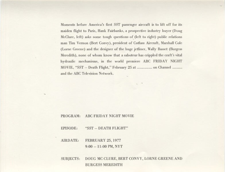 SST Death Flight Doug McClure, Lorne Greene, Burgess Meredith, Bert Convy Original 7x9 Photo with ABC Snipe 1977 VG/Near Mint Condition This item is an ORIGINAL 8x10 photo from the historic archives of Silver Screen Mementos. This original photograph was made in the actual year the film, television show or event was produced. The movie studios produced publicity photographs for distribution to the press, photo agencies and publicity departments to advertise the film/tv show or event. Very often original photos have press release information on the reverse of the photo - movie credits, description of the scene, event and people involved. This is a historic piece of cinema art and is being offered from one collector to another, no rights given or implied. Silver Screen are gradually releasing thousands of Original Photographs, Transparencies, Negatives, Lobby Cards, Posters, Magazines and other memorabilia from our historic archive.