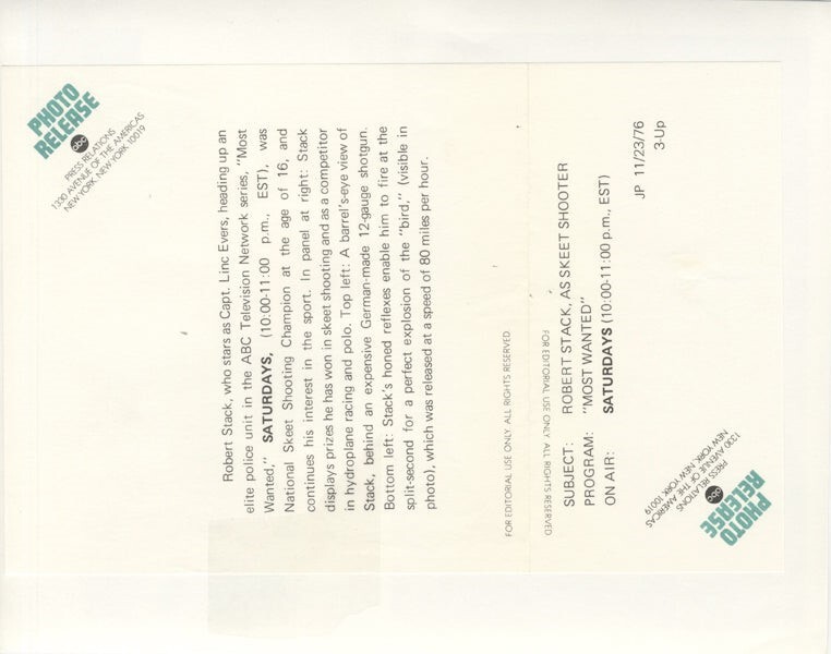 Robert Stack Most Wanted 1976 Publicity Montage Original 7x9 Photo ABC Stamped Near Mint Condition This item is an ORIGINAL 8x10 photo from the historic archives of Silver Screen Mementos. This original photograph was made in the actual year the film, television show or event was produced. The movie studios produced publicity photographs for distribution to the press, photo agencies and publicity departments to advertise the film/tv show or event. Very often original photos have press release information on the reverse of the photo - movie credits, description of the scene, event and people involved. This is a historic piece of cinema art and is being offered from one collector to another, no rights given or implied. Silver Screen are gradually releasing thousands of Original Photographs, Transparencies, Negatives, Lobby Cards, Posters, Magazines and other memorabilia from our historic archive.