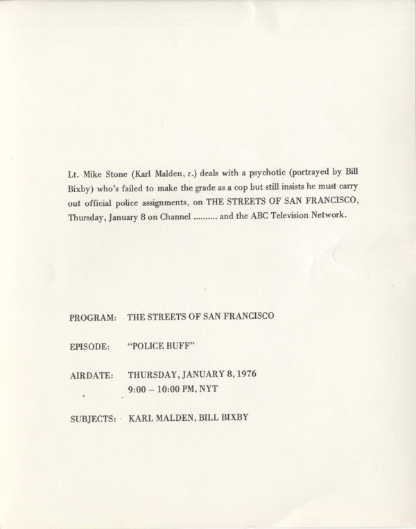The Streets of San Francisco Bill Bixby, Karl Malden Police Buff Episode Original 7x9 Photo with ABC Snipe 1976 VG/Near Mint Condition This item is an ORIGINAL 8x10 photo from the historic archives of Silver Screen Mementos. This original photograph was made in the actual year the film, television show or event was produced. The movie studios produced publicity photographs for distribution to the press, photo agencies and publicity departments to advertise the film/tv show or event. Very often original photos have press release information on the reverse of the photo - movie credits, description of the scene, event and people involved. This is a historic piece of cinema art and is being offered from one collector to another, no rights given or implied. Silver Screen are gradually releasing thousands of Original Photographs, Transparencies, Negatives, Lobby Cards, Posters, Magazines and other memorabilia from our historic archive.