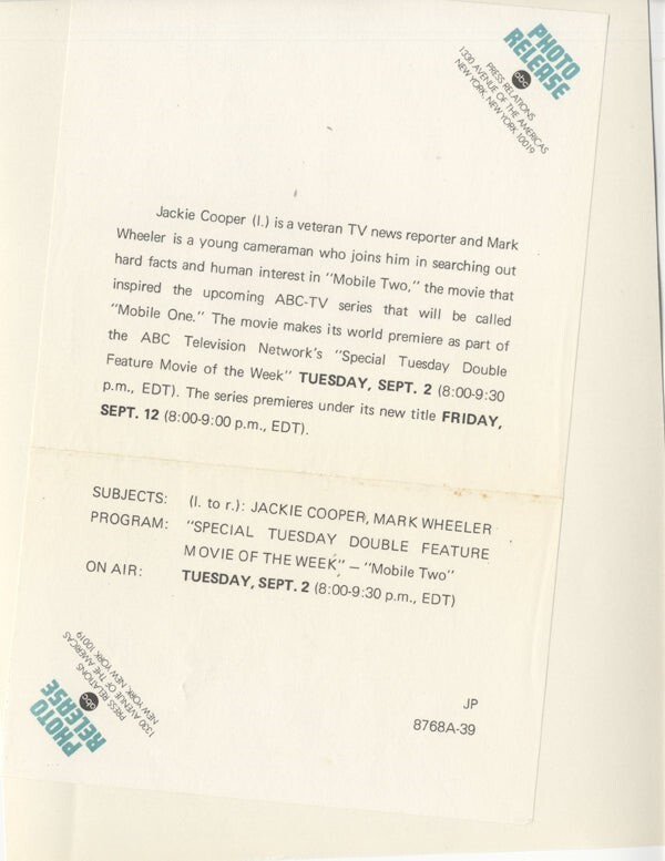 Mobile Two Jackie Cooper, Mark Wheeler TV Series Publicity Original 7x9 Photo with ABC Snipe Near Mint Condition This item is an ORIGINAL 8x10 photo from the historic archives of Silver Screen Mementos. This original photograph was made in the actual year the film, television show or event was produced. The movie studios produced publicity photographs for distribution to the press, photo agencies and publicity departments to advertise the film/tv show or event. Very often original photos have press release information on the reverse of the photo - movie credits, description of the scene, event and people involved. This is a historic piece of cinema art and is being offered from one collector to another, no rights given or implied. Silver Screen are gradually releasing thousands of Original Photographs, Transparencies, Negatives, Lobby Cards, Posters, Magazines and other memorabilia from our historic archive.