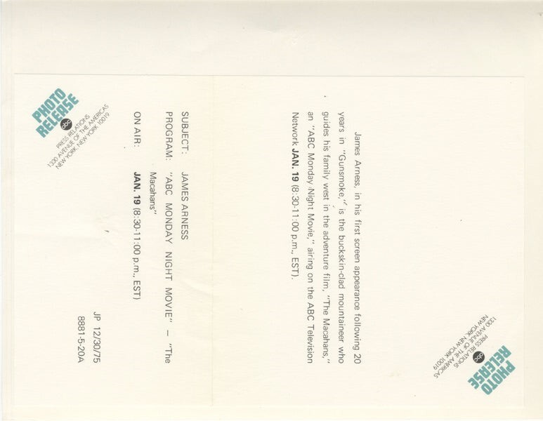 James Arness How the West Was Won The Macahans TV Western Publicity Original 7x9 Photo with ABC Snipe 1975 Near Mint Condition This item is an ORIGINAL 8x10 photo from the historic archives of Silver Screen Mementos. This original photograph was made in the actual year the film, television show or event was produced. The movie studios produced publicity photographs for distribution to the press, photo agencies and publicity departments to advertise the film/tv show or event. Very often original photos have press release information on the reverse of the photo - movie credits, description of the scene, event and people involved. This is a historic piece of cinema art and is being offered from one collector to another, no rights given or implied. Silver Screen are gradually releasing thousands of Original Photographs, Transparencies, Negatives, Lobby Cards, Posters, Magazines and other memorabilia from our historic archive.