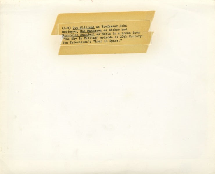Lost in Space Guy Williams Don Matheson Sky is Falling episode Original 8x10 Photo with snipe VG/Near Mint Condition This item is an ORIGINAL 8x10 photo from the historic archives of Silver Screen Mementos. This original photograph was made in the actual year the film, television show or event was produced. The movie studios produced publicity photographs for distribution to the press, photo agencies and publicity departments to advertise the film/tv show or event. Very often original photos have press release information on the reverse of the photo - movie credits, description of the scene, event and people involved. This is a historic piece of cinema art and is being offered from one collector to another, no rights given or implied. Silver Screen are gradually releasing thousands of Original Photographs, Transparencies, Negatives, Lobby Cards, Posters, Magazines and other memorabilia from our historic archive.