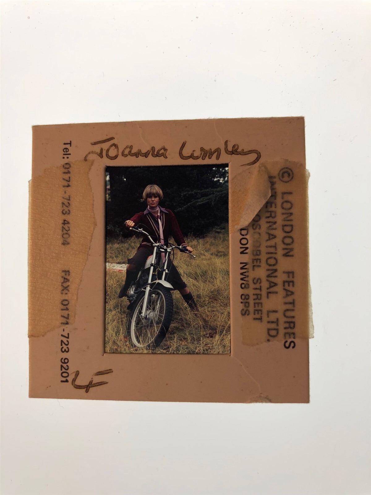 Joanna Lumley The New Avengers Motorcycle Photo Shoot Original 35mm Transparency Stamped MountThis is an original studio or photographer's 35 mm color slide transparency from our historic archive. This is a real collector's item and would make superb quality photographs or prints. This would also be a great addition to any collection or image archive. This original color slide transparency is in Excellent condition. This collector's item is being sold from one collector to another, no rights are given or implied. Silver Screen Mementos are gradually releasing from their vast archives thousands of original photographs, transparencies, negatives, slides, lobby cards and other movie or television memorabilia.