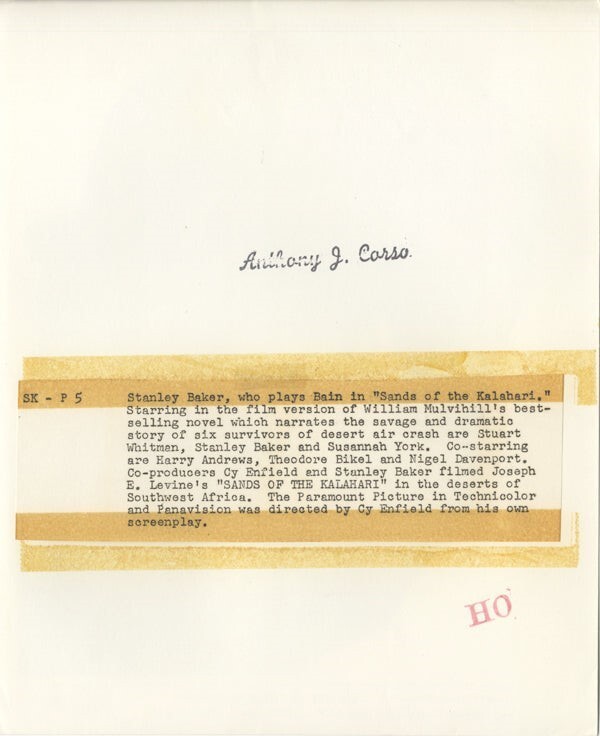 Stanley Baker Sands of the Kalahari 1965 Rugged Portrait Original 8x10 Photo with Snipe VG/Near Mint Condition This item is an ORIGINAL 8x10 photo from the historic archives of Silver Screen Mementos. This original photograph was made in the actual year the film, television show or event was produced. The movie studios produced publicity photographs for distribution to the press, photo agencies and publicity departments to advertise the film/tv show or event. Very often original photos have press release information on the reverse of the photo - movie credits, description of the scene, event and people involved. This is a historic piece of cinema art and is being offered from one collector to another, no rights given or implied. Silver Screen are gradually releasing thousands of Original Photographs, Transparencies, Negatives, Lobby Cards, Posters, Magazines and other memorabilia from our historic archive.
