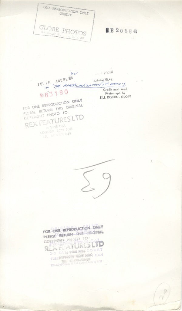 Julie Andrews 1964 The Americanization of Emily Original 8x13 inch approx Double Weight Silver Gelatin Stamped Photo in VG Condition (some edge wear) This item is a Vintage Original Oversized Silver Gelatin photograph from the historic archives of Silver Screen Mementos. We have a huge collection of original vintage oversized photographs that were produced by the photographer or photo agency with most having the photographer/agency stamp on the back and many with snipe detailing information about the shoot or subject. These are extremely rare collectors items and will be shipped securely in protective archival top loader holder and strong packaging to ensure safe delivery. This is a historic piece of photographic art and is being offered from one collector to another, no rights given or implied. Silver Screen are gradually releasing thousands of Original Photographs, Transparencies, Negatives, Lobby Cards, Posters, Magazines and other memorabilia from our historic archive.