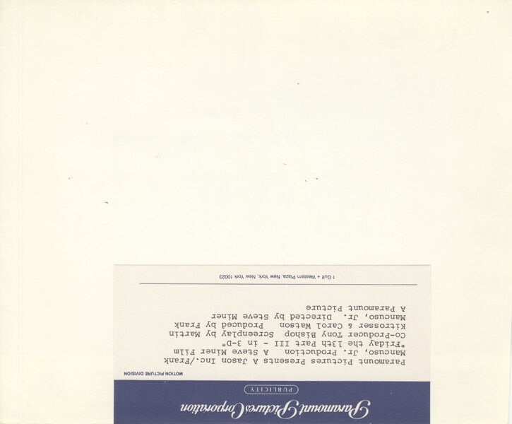 Friday the 13th 3-D Part 3 1982 Dana Kimmell Original 8x10 Photo with snipe - Near Mint This item is an ORIGINAL 8x10 photo from the historic archives of Silver Screen Mementos. This original photograph was made in the actual year the film, television show or event was produced. The movie studios produced publicity photographs for distribution to the press, photo agencies and publicity departments to advertise the film/tv show or event. Very often original photos have press release information on the reverse of the photo - movie credits, description of the scene, event and people involved. This is a historic piece of cinema art and is being offered from one collector to another, no rights given or implied. Silver Screen are gradually releasing thousands of Original Photographs, Transparencies, Negatives, Lobby Cards, Posters, Magazines and other memorabilia from our historic archive.
