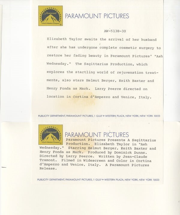 Elizabeth Taylor 1973 Ash Wednesday Glamorous Original 8x10 Photo snipe - Near Mint This item is an ORIGINAL 8x10 photo from the historic archives of Silver Screen Mementos. This original photograph was made in the actual year the film, television show or event was produced. The movie studios produced publicity photographs for distribution to the press, photo agencies and publicity departments to advertise the film/tv show or event. Very often original photos have press release information on the reverse of the photo - movie credits, description of the scene, event and people involved. This is a historic piece of cinema art and is being offered from one collector to another, no rights given or implied. Silver Screen are gradually releasing thousands of Original Photographs, Transparencies, Negatives, Lobby Cards, Posters, Magazines and other memorabilia from our historic archive.
